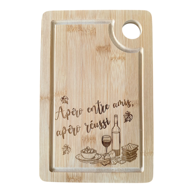 À la fois planche apéro et objet déco, elle se sort quand il faut servir… et elle reste visible le reste du temps. Le bambou apporte une touche naturelle, la gravure fait clairement le job.