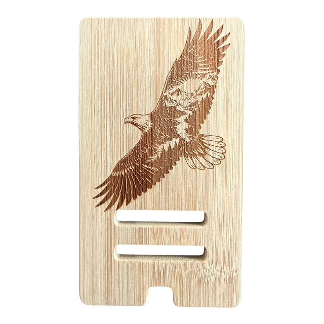 Support téléphone en bambou gravé, conçu pour accueillir aussi bien les petits que les grands smartphones grâce à son système réglable.