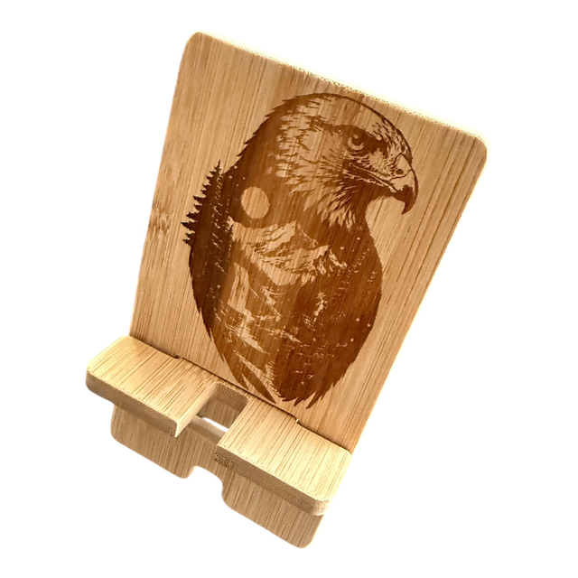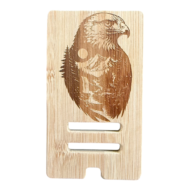 Support téléphone en bambou gravé, conçu pour accueillir aussi bien les petits que les grands smartphones grâce à son système réglable.