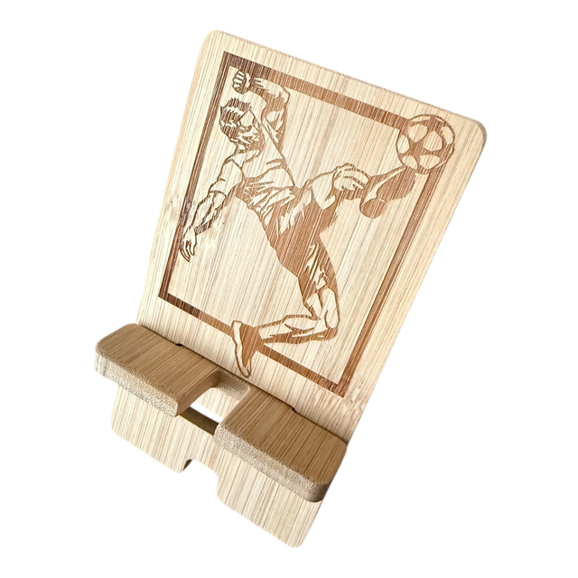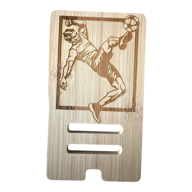 Support téléphone en bambou gravé, conçu pour accueillir aussi bien les petits que les grands smartphones grâce à son système réglable.