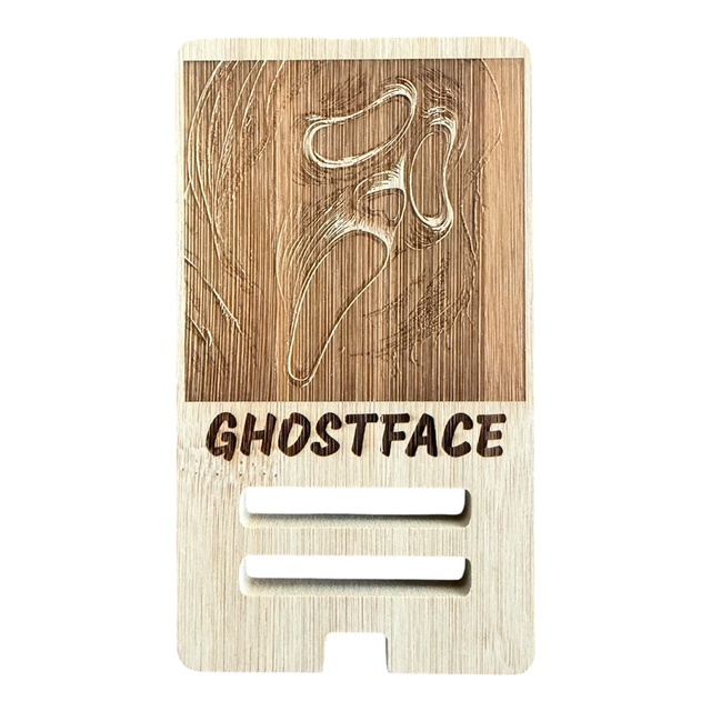 Support téléphone en bambou gravé, conçu pour accueillir aussi bien les petits que les grands smartphones grâce à son système réglable.
